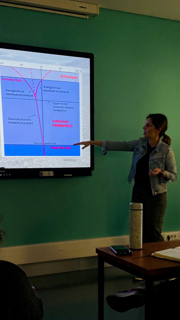 Michaela Kňažková, who is visiting us for a week, gave a lecture this Monday at the Seminar on Physical Geography about Permafrost on James Ross Island. In her lecture, she discussed the interannual variability of soil thermal conductivity and moisture, as well as the linkage between active layer thickness and the seasonal amount and availability of liquid water, and its impact on the abundance and health of vegetation on James Ross Island, Antarctica.